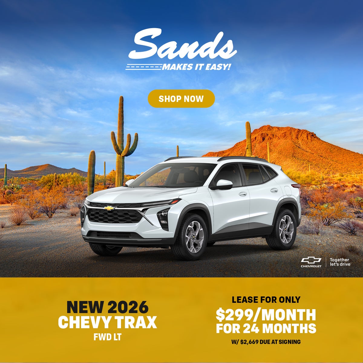 "Low-Mileage Lease for Well-Qualified Lessees.$299/monthfor 24 months.For Eligible Current Lessees:$2,669 due at signing (after all offers).**$0 security deposit.Tax, title, license, and dealer fees extra.Mileage charge of $0.25/mile over 20,000 miles at participating dealers.**Current Lessees of a 2021 model year or newer GM or Non-GM passenger car or truck at least 30 days prior to the lease of a new GM vehicle through GM Financial. Customer remains responsible for current lease payments. Each dealer sets own price. $299/month for 24 months. Your payments may vary. Payments are for a 2026 CHEVROLET Trax FWD LT with an MSRP of $24,995. Based on due at signing amount of $2,669 (after all offers). 24 monthly payments total $7,176. Must show proof of lease. Option to purchase at lease end for an amount to be determined at lease signing. Lessor must approve lease. Lessee pays for maintenance, repair, excess wear and disposition fee of $395 or less at end of lease. No security deposit required. Payments may be higher in some states. Not available with other offers. Take new retail delivery by 04-30-2026."